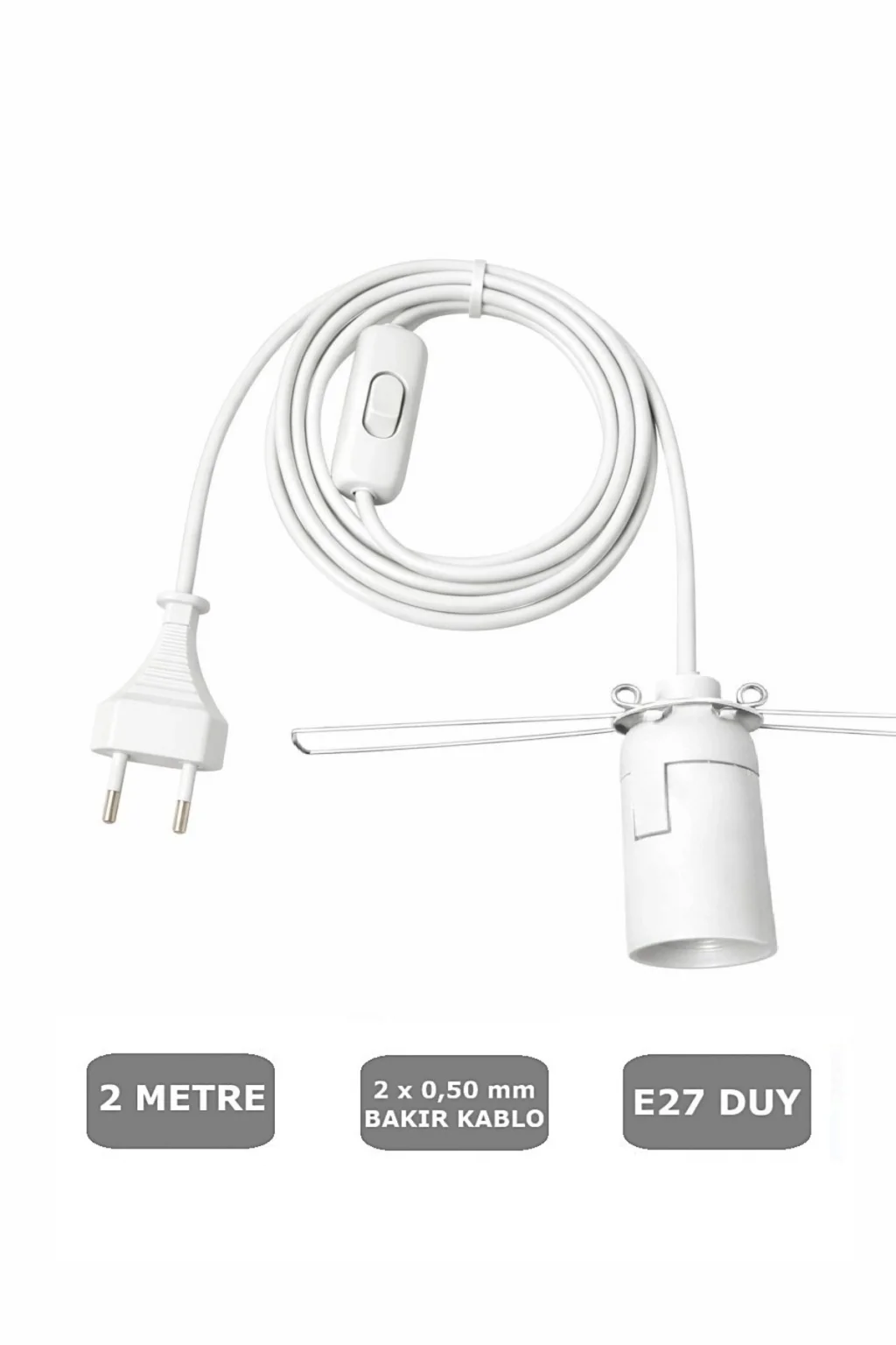 - Türkiye'de üretilmiş olup, yerel üretim avantajlarıyla öne çıkar.; - E27 duy tipi sayesinde geniş bir ampul yelpazesi ile uyumluluk gösterir.; - 2 metre uzunluğundaki seyyar kablosu, farklı alanlarda kullanım kolaylığı sağlar.; - Aç-kapat anahtarı ile pratik bir kullanım sunar ve ışık kontrolü sağlar.; - 65W'a kadar güç kapasitesiyle enerji verimliliği sunar ve aydınlatma ihtiyaçlarınıza cevap verir.;