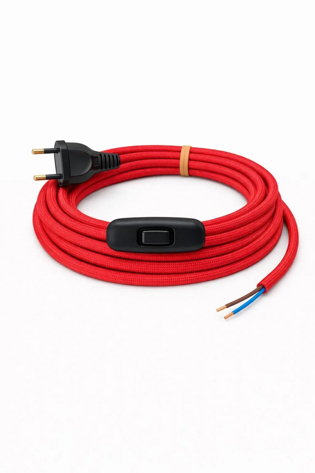 Kumaş Örgü Kablolu, Arapuar Anahtarlı Fiş (2X0,50) Kırmızı - 2 Metre